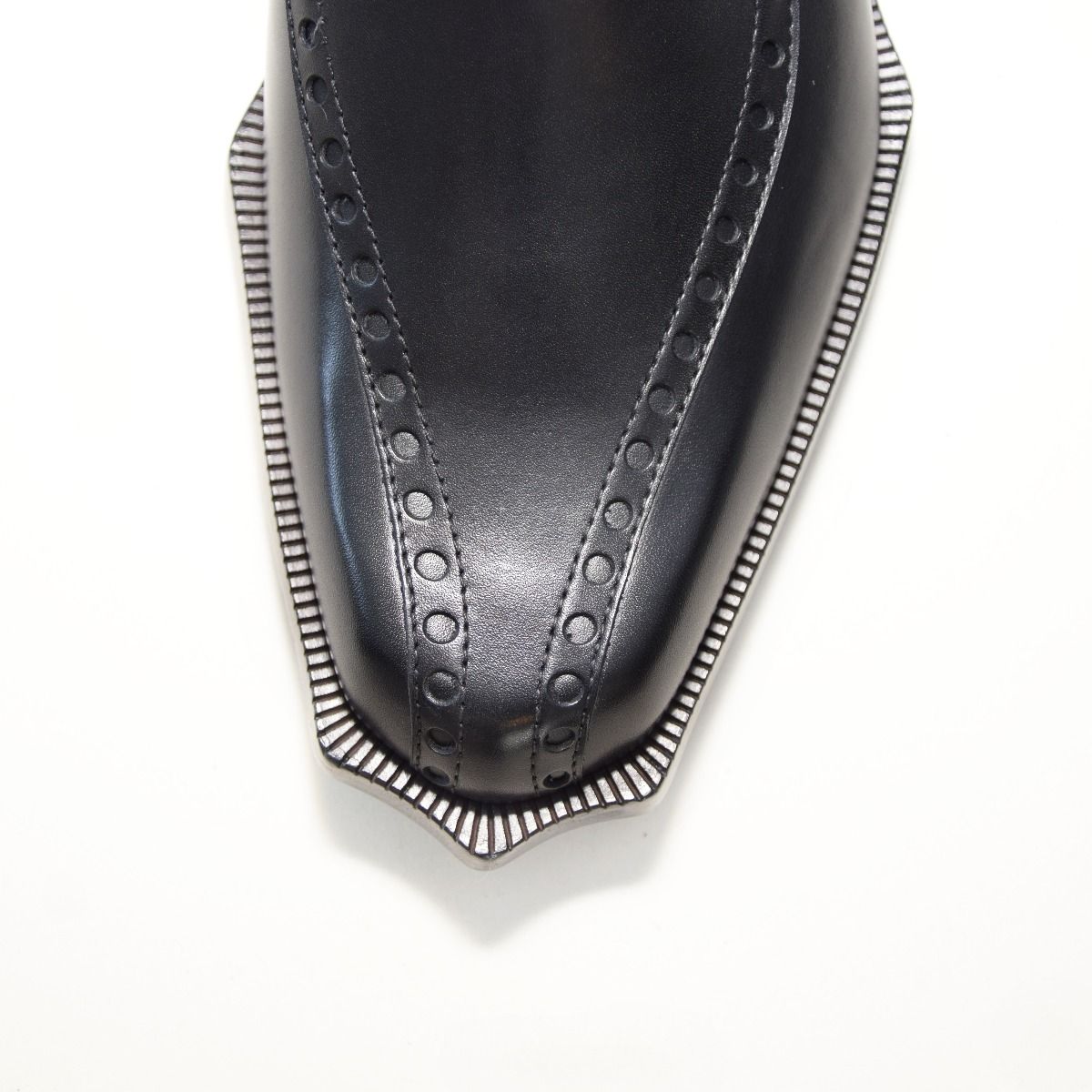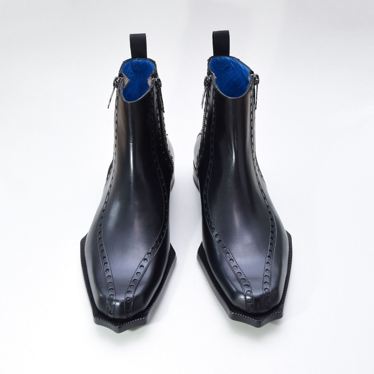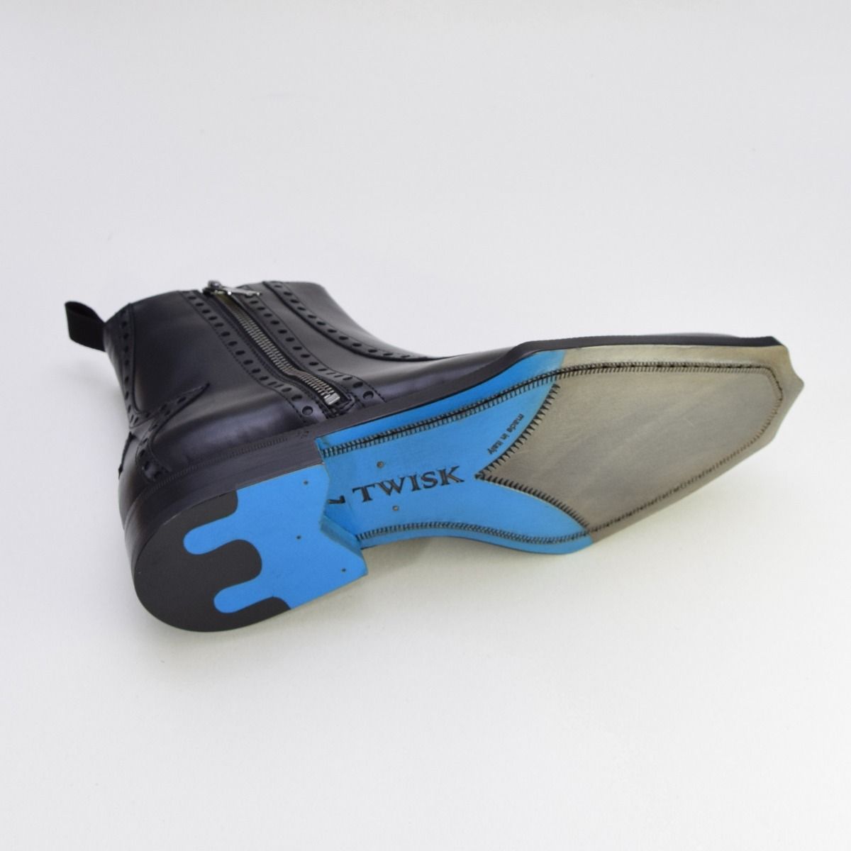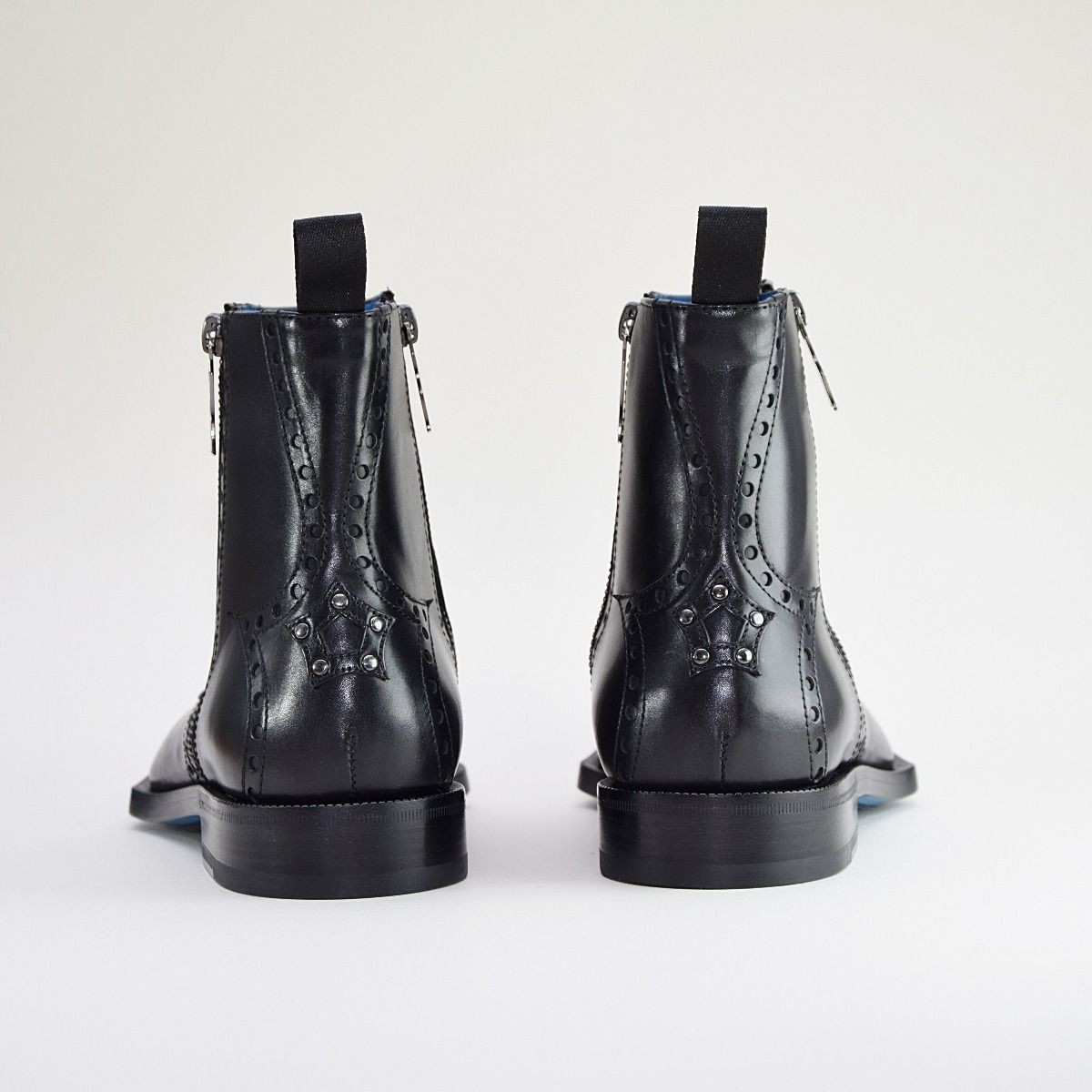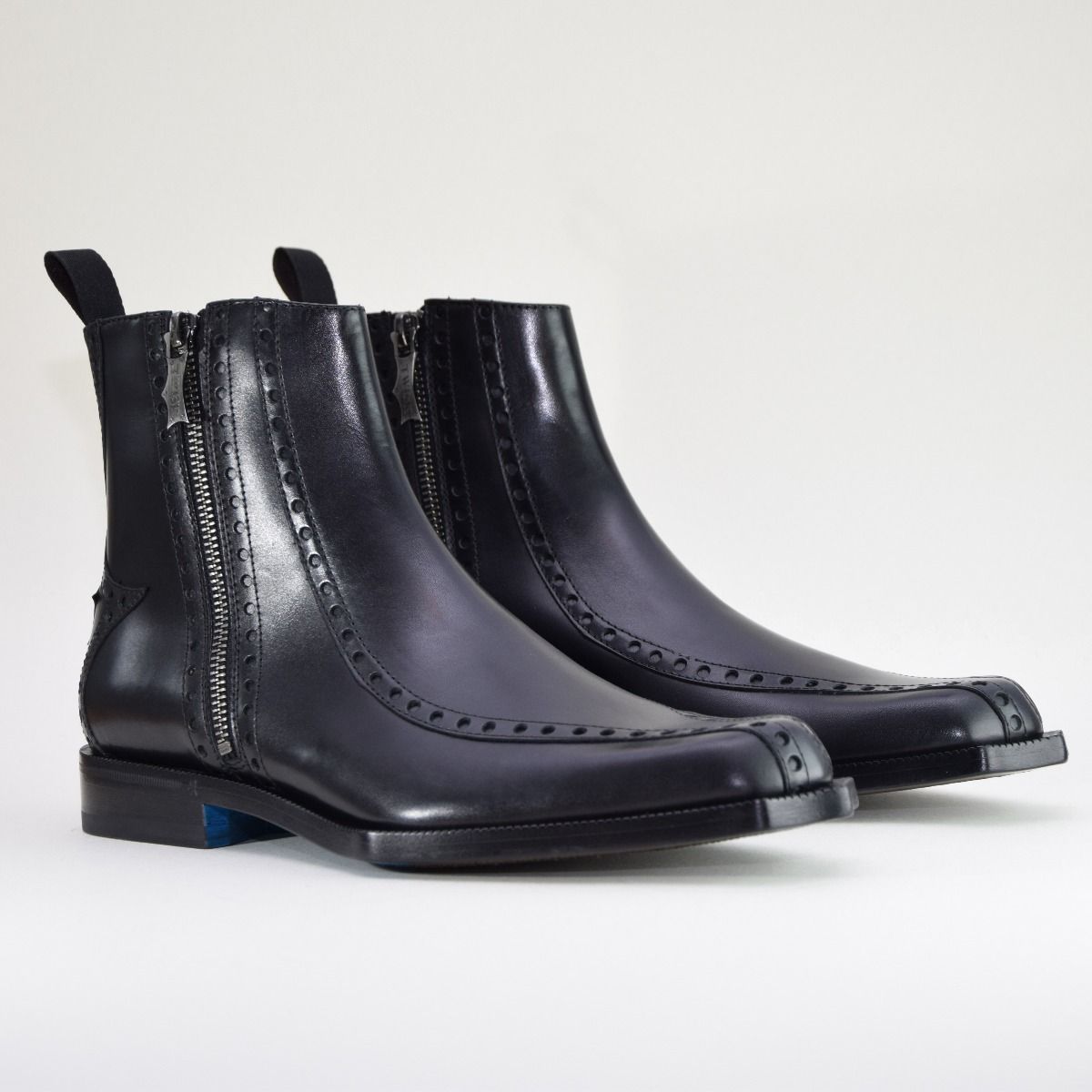 With sweeping lines of brogueing and a double zip design, the Hustler is a sensational boot that combines cutting-edge style with luxurious comfort. Designed in Britain and handmade in Italy by master shoemakers from the finest calf leather, the innovative toe shaping makes this boot a unique statement piece. Hand finished with two diagonal zips and Twisk hallmark star-formation studs, this slimline Blake stitched boot is a work of genius.